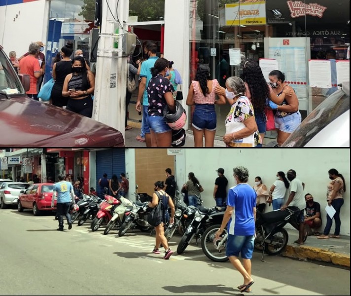 As filas são para entrar na agência do Bradesco na Rua Santa Luzia e da Caixa Econômica na Rua Da Conceição. Em frente à entrada da Caixa há respeito em relação ao distanciamento social, mas existe aglomeração metros depois indo até a Rua São Francisco.